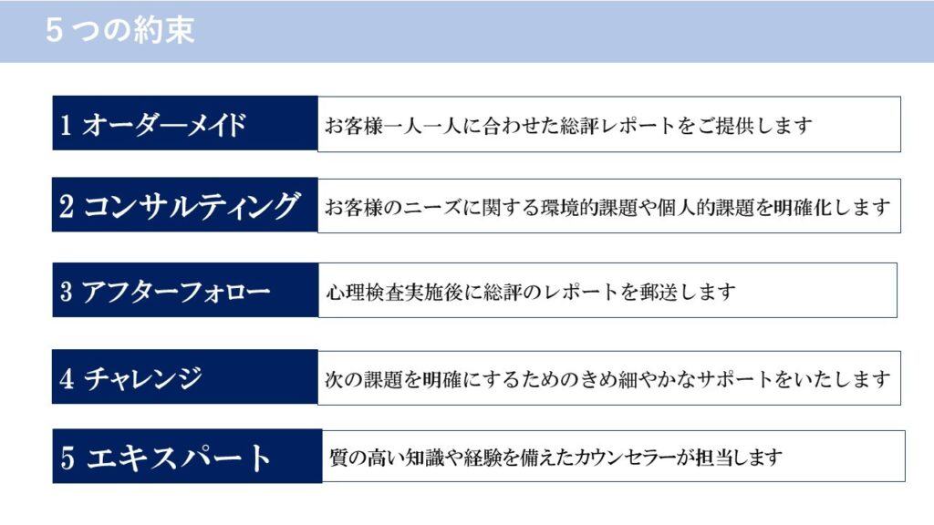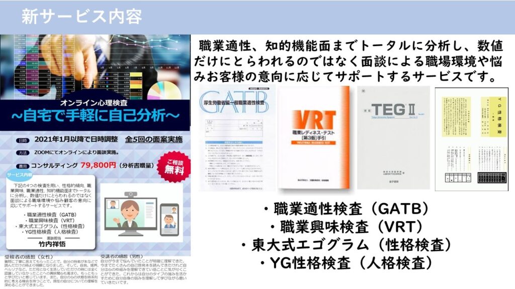 4つの検査を用い、性格的傾向、職業興味、職業適性、知的機能面までトータルに分析し、数値だけにとらわれるのではなく面談による職場環境や悩みお客様の意向に応じてサポートするサービスです。心理検査を実施するにあたり別で全5回以内の面談も実施いたします。